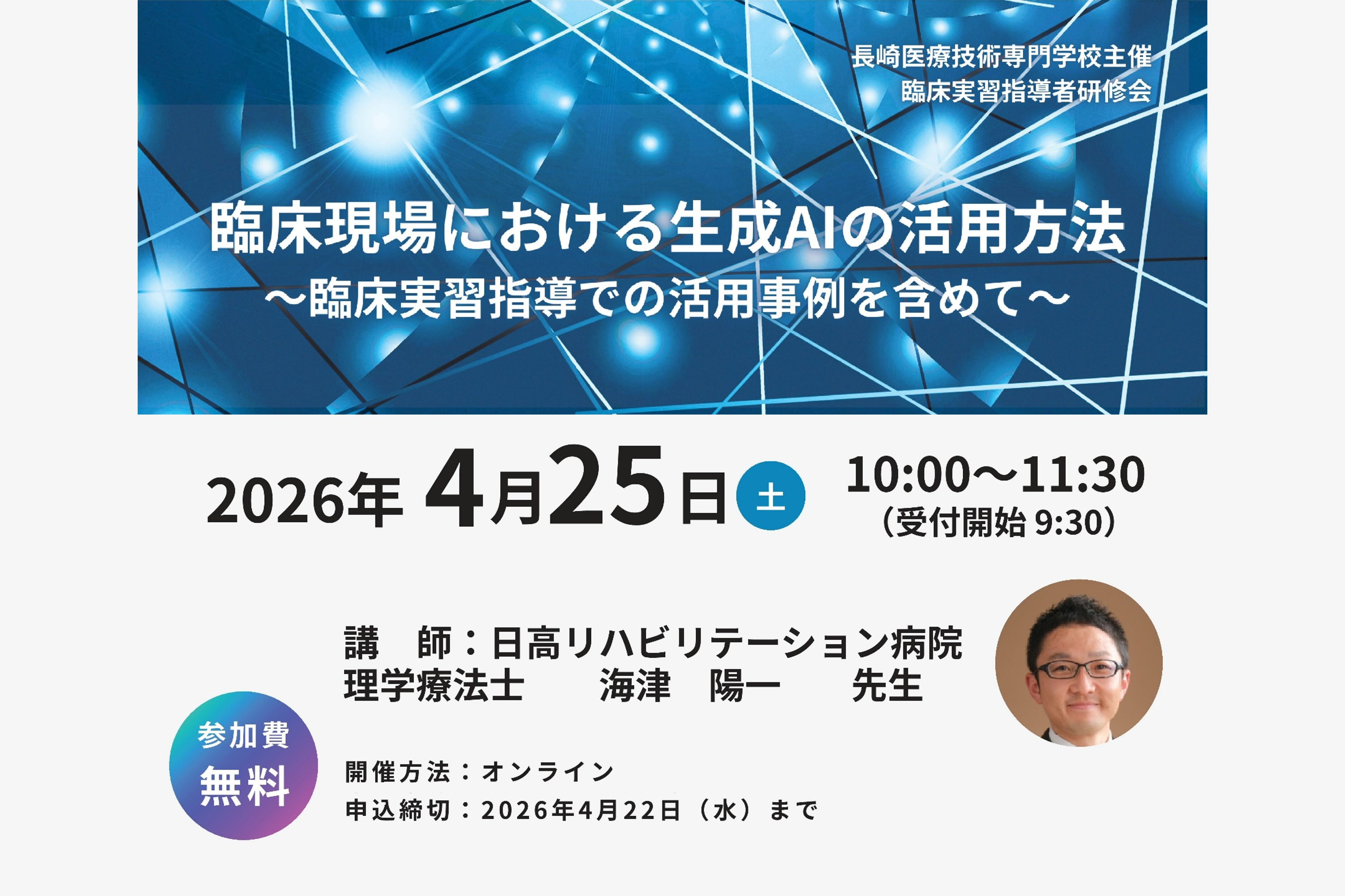 案内チラシ 【内容】 日付:2026年4月25日(土)10時00分~11時30分 テーマ:「臨床現場における生成AIの活用方法~臨床実習指導での活用事例を含めて~」 講師:海津 陽一 先生(日高リハビリテーション病院 理学療法士) 主催:長崎医療技術専門学校 開催形式:オンライン(Zoom) 対象:長崎医療技術専門学校 …